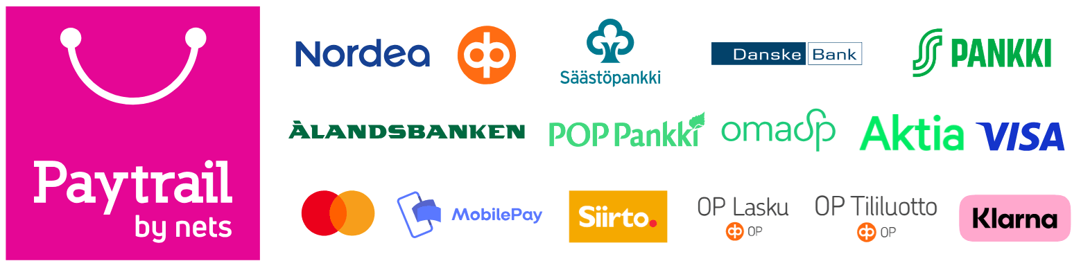 Verkkokaupassamme voit maksaa verkkopankissa, maksupainikkeilla (Nordea, Osuuspankki, DanskeBank, Aktia, Säästöpankki, OmaSP, Ålandsbanken, S-Pankki ja POP-Pankki). Voit maksaa myös mobiilimaksutavoilla (MobilePay ja Siirto) sekä kortilla (Visa, Visa Electron ja Mastercard). Paytrail tarjoaa myös OP Laskun ja OP Tililuoton, eli voit ostaa tilauksen myös OP:n laskulla tai osamaksulla.